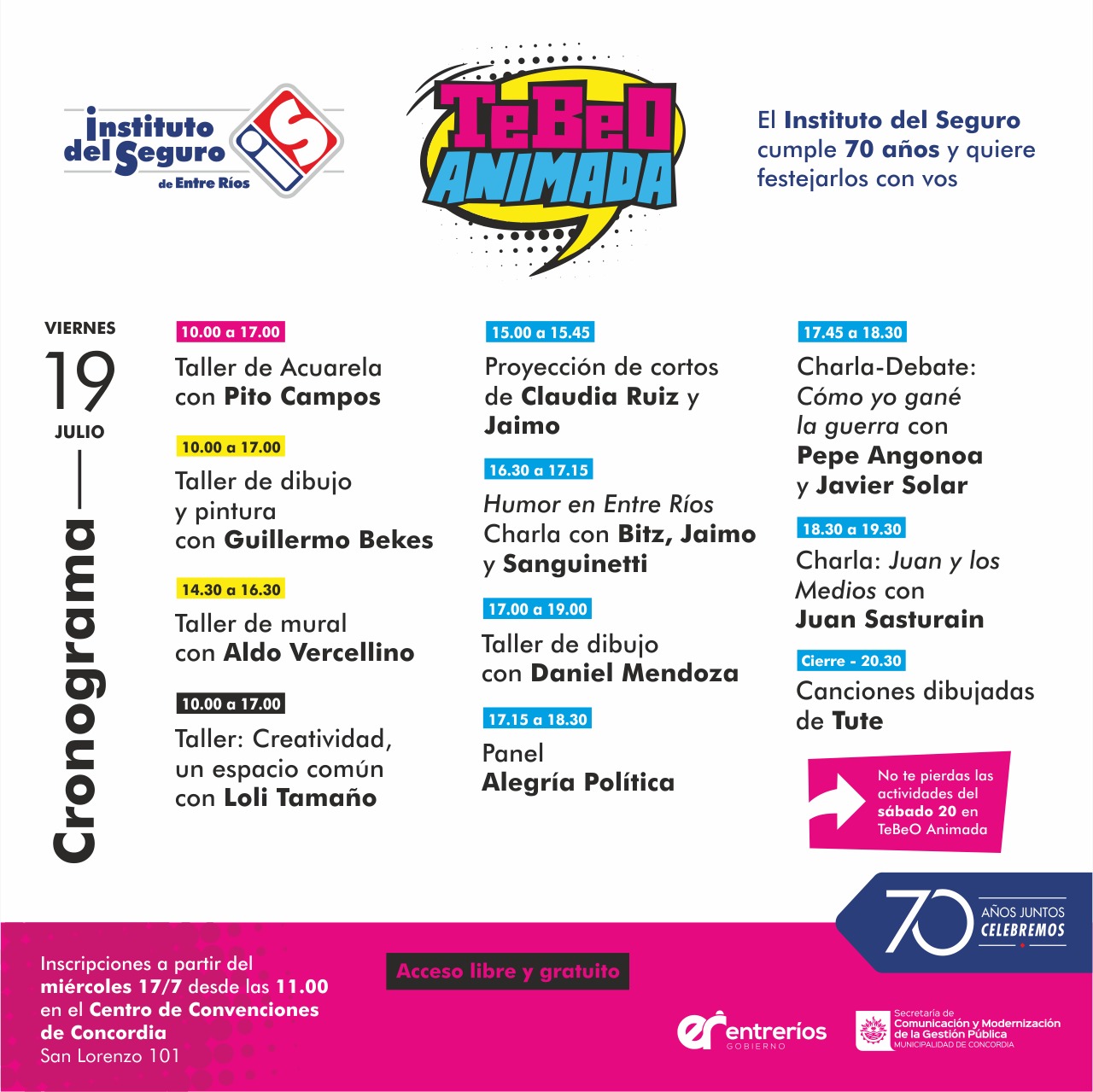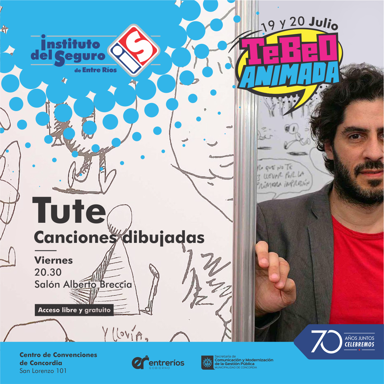 Gran expectativa generó en la Costa del Uruguay la eventual presentación del TeBeo Animada que presenta el Instituto del Seguro de Entre Ríos en el marco del 70 aniversario de su creación. Se trata de una plataforma cultural que convoca a destacados artistas que brindarán talleres, clases y exposiciones sobre comic, historieta, manga y literatura. Figuras como Tute, Juan Sasturain, Loli Tamaño, Daniel Mendoza, Aldo Vercellino, Guillermo Bekes, o Los Cafres y un sinnúmero de figuras constituyen el espíritu de esta iniciativa. La actividad se realizará los días 19 y 20 de julio y el TeBeo Animada se perfila como una experiencia única para la región con acceso libre y gratuito.